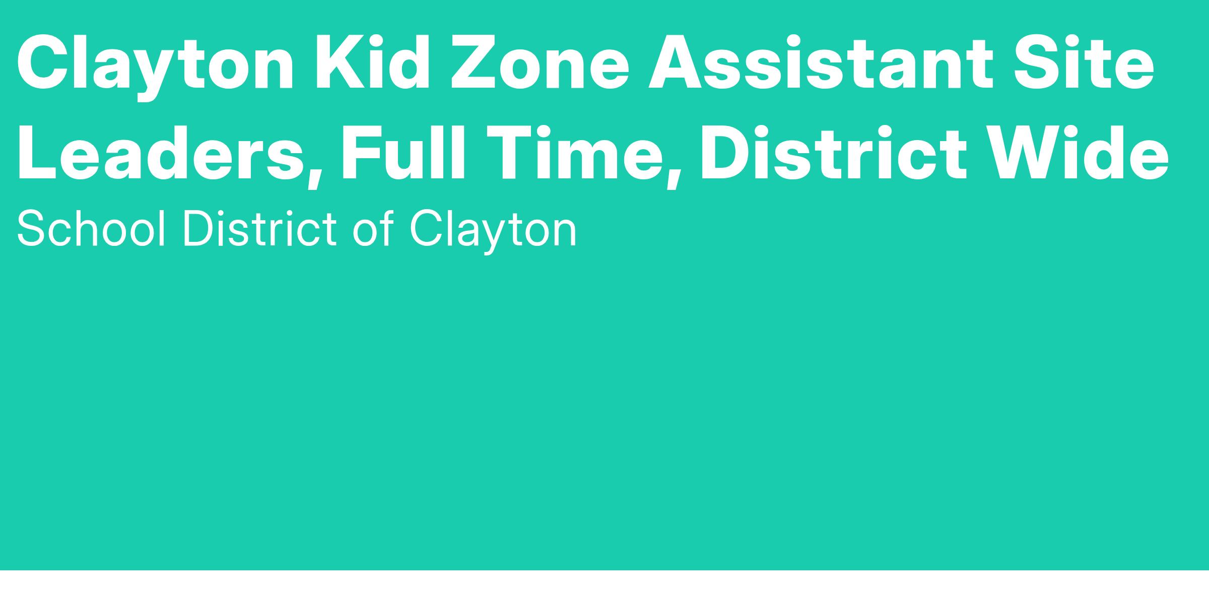 The School District of Clayton is seeking a full-time Assistant Site Leader for the before and after school program (Clayton Kid Zone) for the 2025-2026 school year. The ideal candidates will be responsible for assisting the Site Leader with effective program management, along with program and curriculum planning for the individual site. Takes the lead position when the Site Leader or Program Coordinator is not present. This is a ten-month position. Scheduled hours for this position are 6:45-8:30 am and 3:00-6:00 pm (shifts may vary), plus additional hours for planning time, full-day programs, early release days, professional development, and meetings.